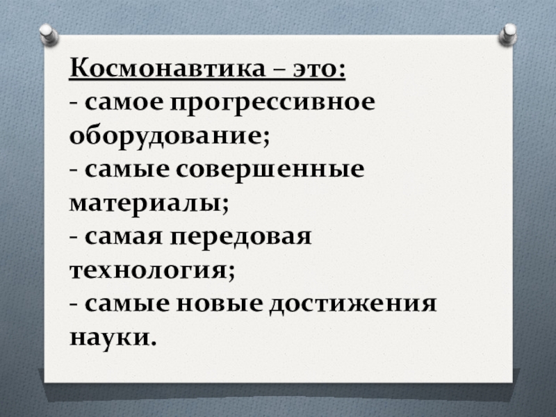 Космонавтика – это: - самое прогрессивное оборудование; - самые совершенные материалы; - самая передовая технология; - самые
