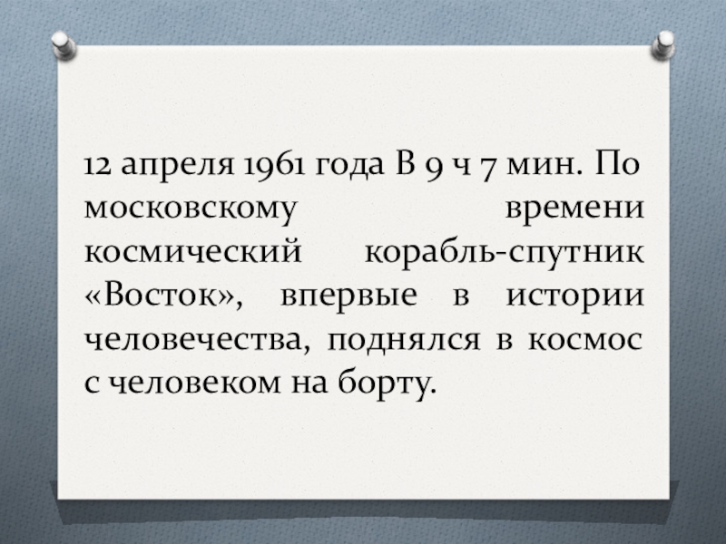 12 апреля 1961 года В 9 ч 7 мин. По московскому времени космический корабль-спутник «Восток», впервые в