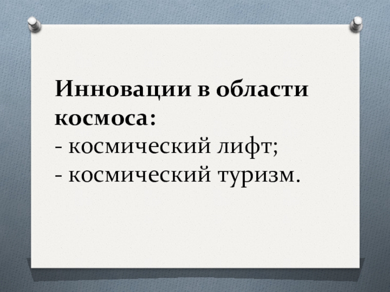Инновации в области  космоса: - космический лифт; - космический туризм.