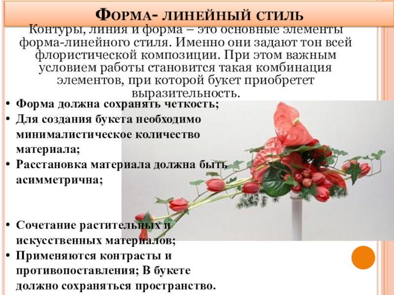 Применяются контрасты и противопоставления; В букете должно сохраняться пространство.
