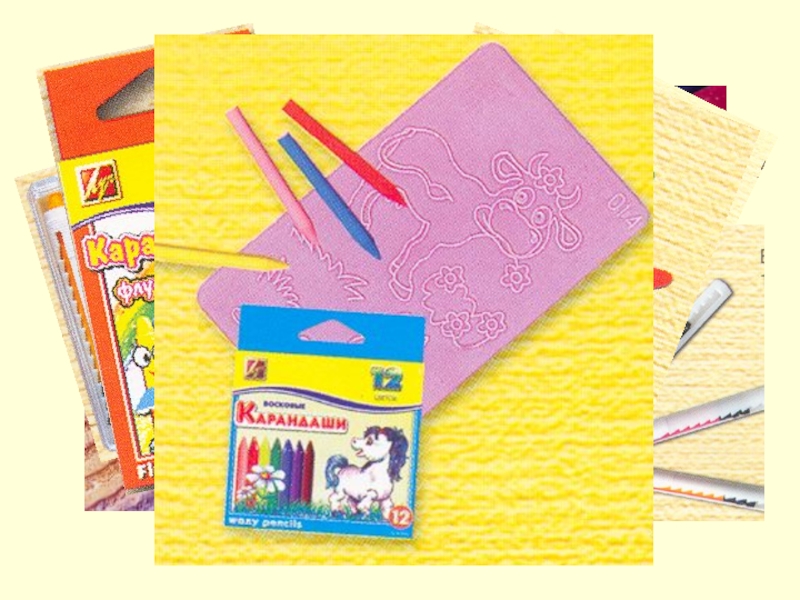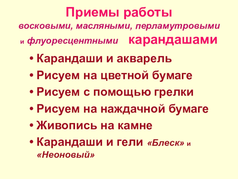 Слайд 2Приемы работы восковыми, масляными, перламутровыми и флуоресцентными карандашами