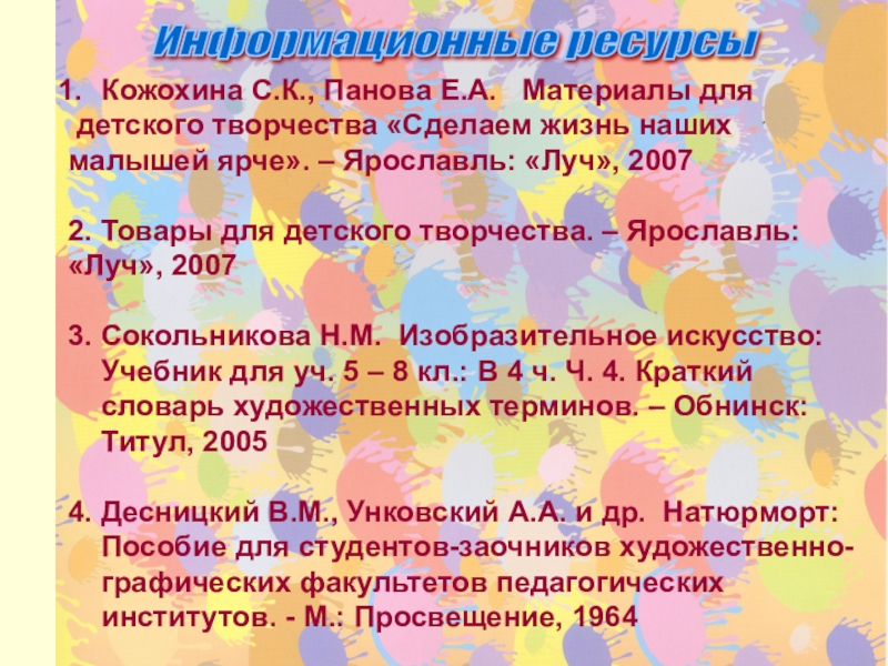 3. Сокольникова Н.М. Изобразительное искусство: Учебник для уч. 5 – 8 кл.: В 4 ч. Ч. 4. Краткий словарь художественных терминов. – Обнинск: Титул, 2005