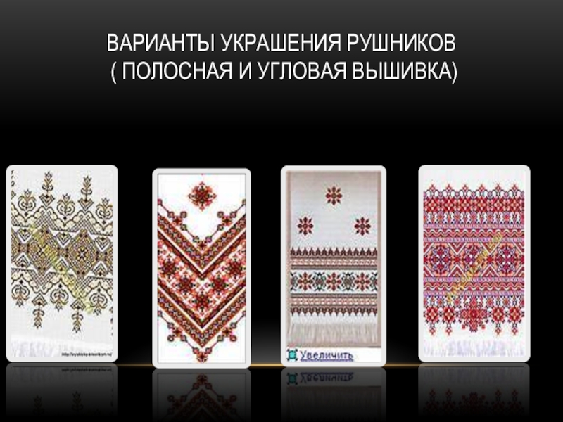 Слайд 19Варианты украшения рушников ( полосная и угловая вышивка)