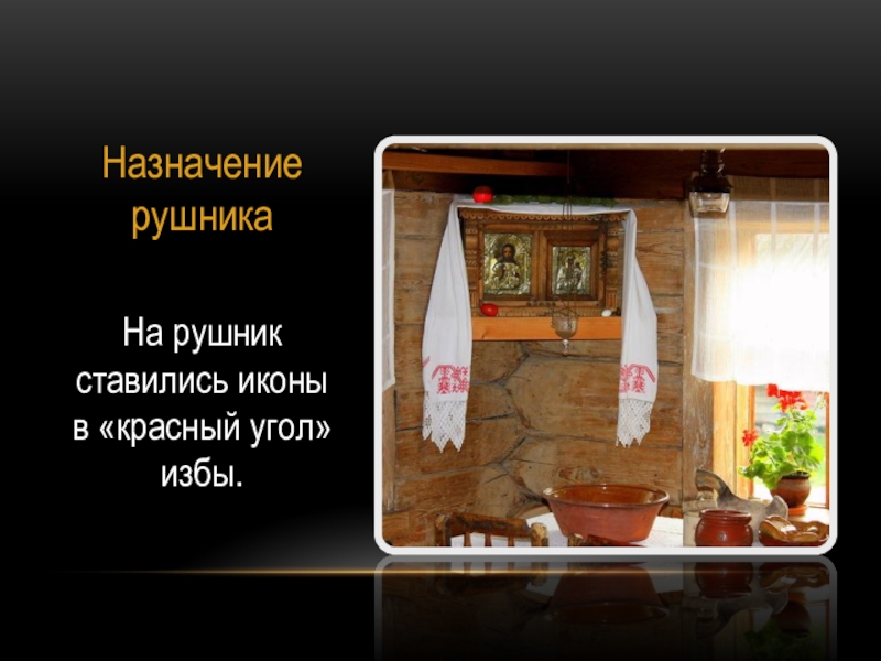 Назначение рушникаНа рушник ставились иконы в «красный угол» избы.