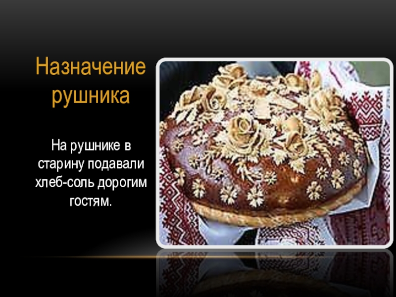 Назначение рушникаНа рушнике в старину подавали хлеб-соль дорогим гостям.