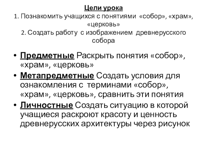 Предметные Раскрыть понятия «собор», «храм», «церковь»