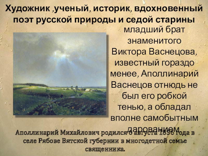 Художник ,ученый, историк, вдохновенный поэт русской природы и седой старины