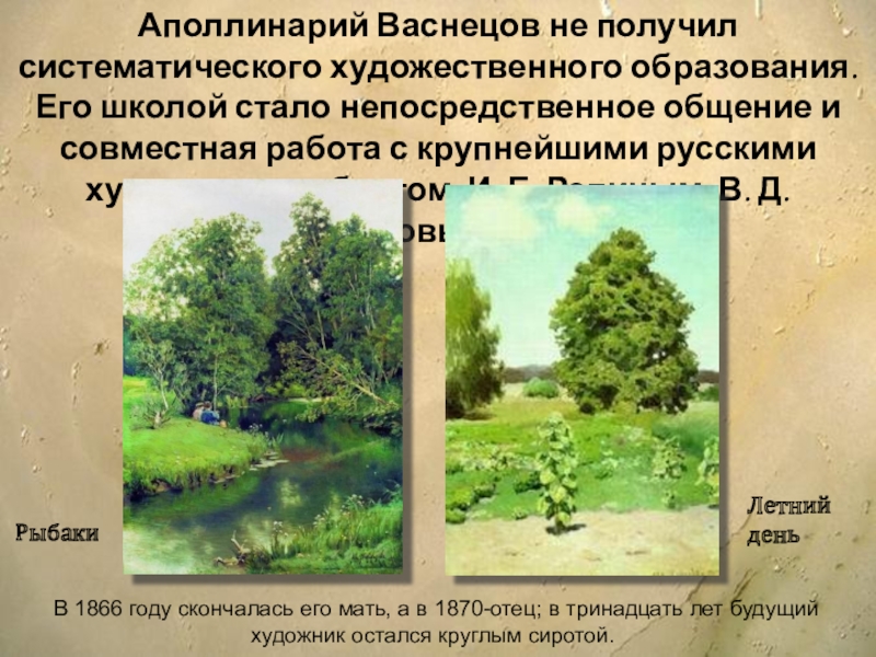 Аполлинарий Васнецов не получил систематического художественного образования. Его школой стало непосредственное общение и совместная работа с крупнейшими русскими художниками: братом, И. Е. Репиным, В. Д. Поленовым и др.