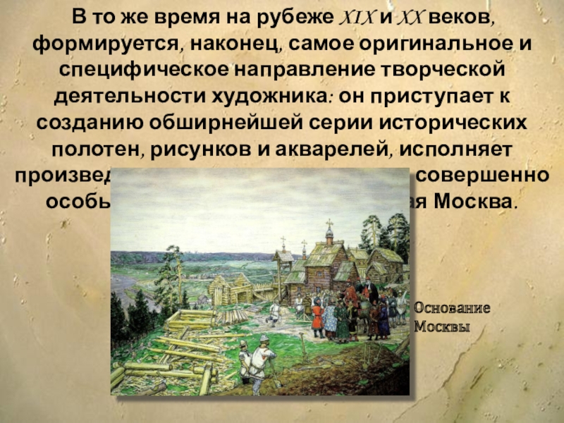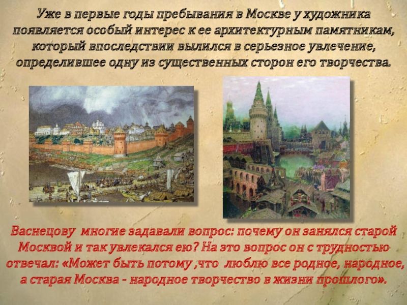Уже в первые годы пребывания в Москве у художника появляется особый интерес к ее архитектурным памятникам, который впоследствии вылился в серьезное увлечение, определившее одну из существенных сторон его творчества.