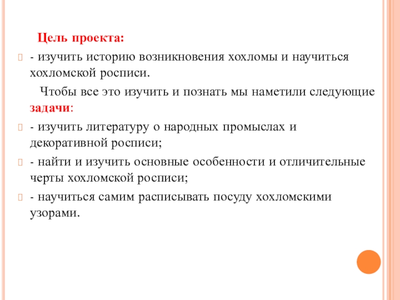 Цель проекта:- изучить историю возникновения хохломы и научиться хохломской росписи.   Чтобы все