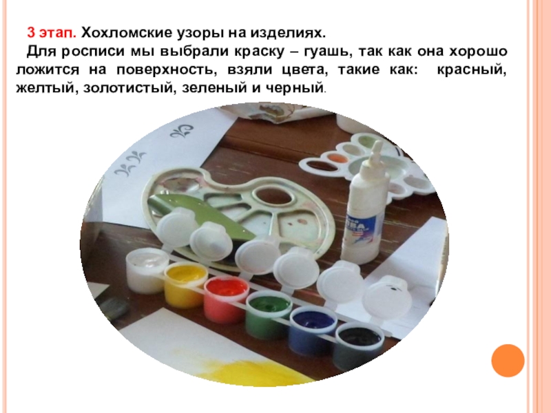 3 этап. Хохломские узоры на изделиях.Для росписи мы выбрали краску – гуашь, так как она хорошо ложится