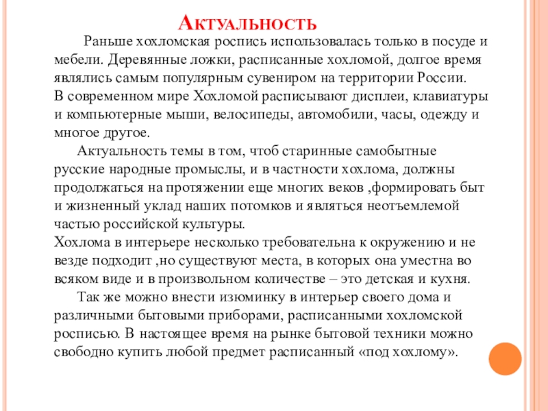 Раньше хохломская роспись использовалась только в посуде и мебели. Деревянные ложки, расписанные хохломой, долгое время являлись самым популярным сувениром на территории России. В современном мире Хохломой расписывают дисплеи, клавиатуры и компьютерные мыши, велосипеды, автомобили, часы, одежду и многое другое.  Актуальность темы в том, чтоб старинные самобытные русские народные промыслы, и в частности хохлома, должны продолжаться на протяжении еще многих веков ,формировать быт и жизненный уклад наших потомков и являться неотъемлемой частью российской культуры. Хохлома в интерьере несколько требовательна к окружению и не везде подходит ,но существуют места, в которых она уместна во всяком виде и в произвольном количестве – это детская и кухня.  Так же можно внести изюминку в интерьер своего дома и различными бытовыми приборами, расписанными хохломской росписью. В настоящее время на рынке бытовой техники можно свободно купить любой предмет расписанный «под хохлому».