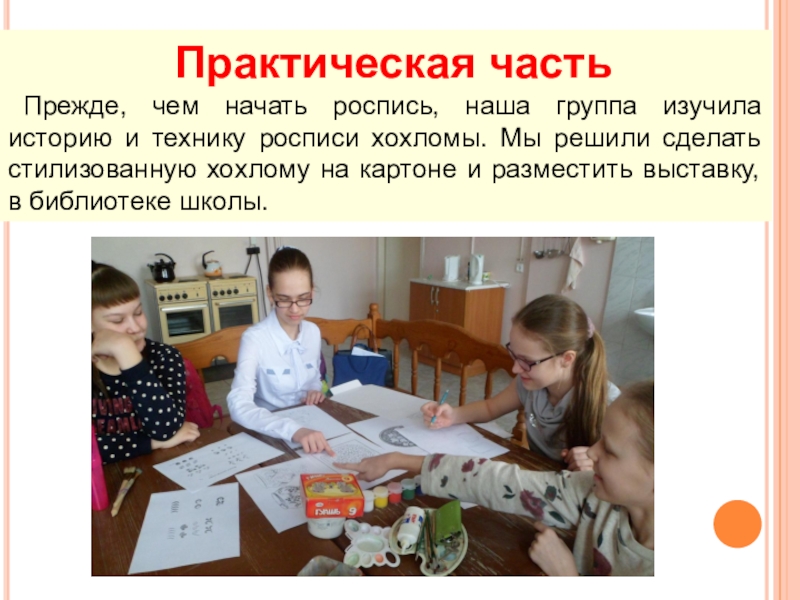 Практическая частьПрежде, чем начать роспись, наша группа изучила историю и технику росписи хохломы. Мы решили сделать стилизованную