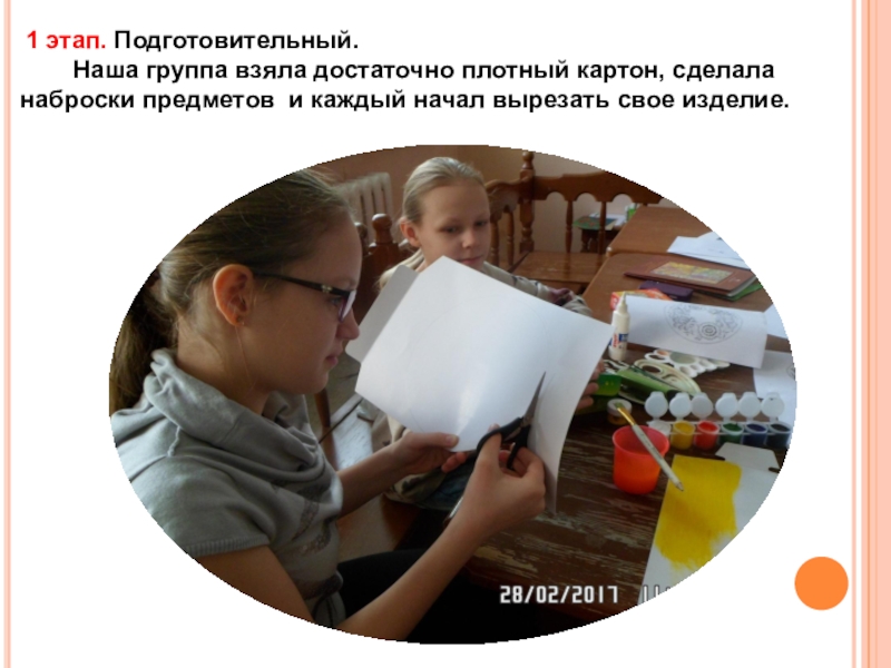 1 этап. Подготовительный.  Наша группа взяла достаточно плотный картон, сделала наброски предметов и каждый начал вырезать