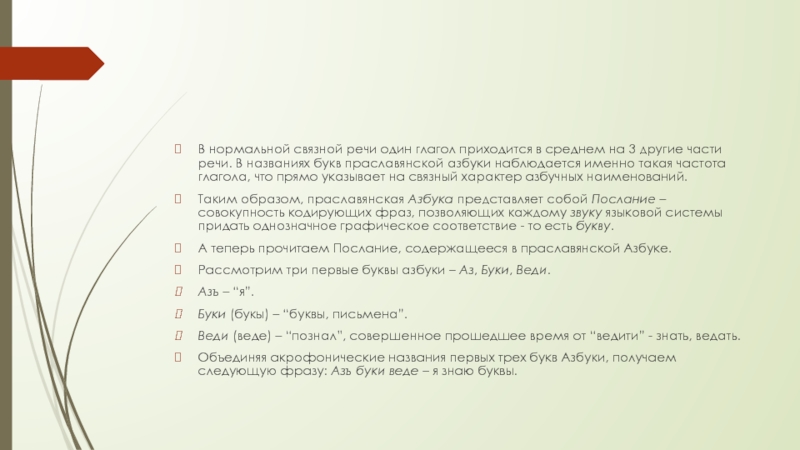 другие части речи. В названиях букв праславянской азбуки наблюдается именно такая частота глагола, что прямо указывает на связный характер азбучных наименований.