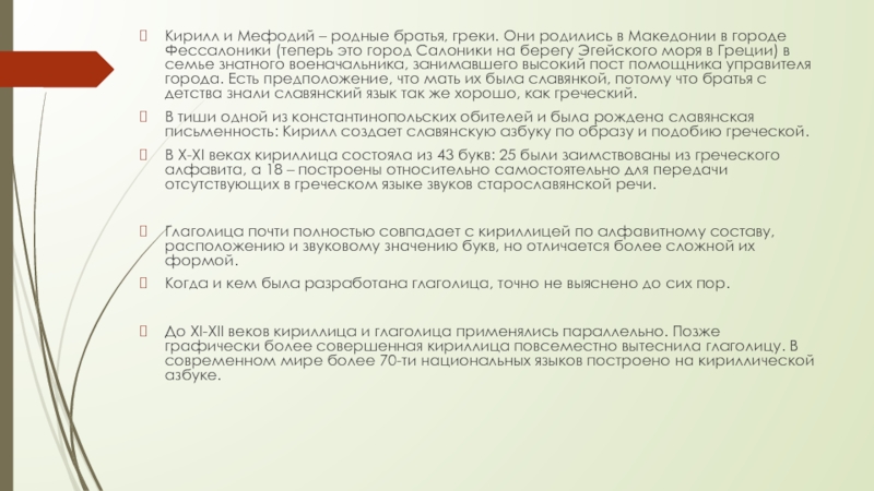 В 60-е годы IХ столетия ,когда их племена расселились на большой территории Центральной,Юго-Восточной и Восточной Европы от Эльбы до Волги, от Причерноморья до Балтики и Создали свои первые государства: Великая Моравия, Паннонское княжество, Киевская Русь,Польское королевство, Болгария, Сербия, Хорватия. Молодым славянским государствам понадобился свой письменный язык для общения с соседями, для укрепления власти, для приобщения к новым формам духовной жизни через христианство, пришедшее на смену древнему язычеству. Таково было веление времени и жизни. Ксчастью славян, среди греков блестяще образовынный и талантливый ученый, знавший греческий,славянский,латинский,арабский,еврейский языки, который взялся создать азбуку,отражавшуюживущую славянскую речь. Это был библиотекарь главной византийской библиотеки Константин, по прозвищу философ, позже принявший в монашестве имя Кирилл. Ему помогал старший брат Мефодий. В истории славянской культуры солунскими братьями, или солунской двоицей. Родом они были из города Солуни (Фессалоники), где совместно проживали греки и славяне. По некоторым источникам, и сами братья были наполовину славянами.
