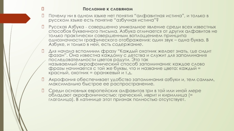 Русская Азбука - совершенно уникальное явление среди всех известных способов буквенного письма. Азбука отличается от других алфавитов не только практически совершенным воплощением принципа однозначности графического отображения: один звук – одна буква. В Азбуке, и только в ней, есть содержание.