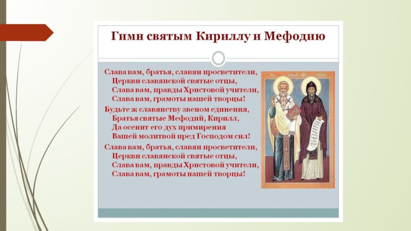 Святых братьев Кирилла и Мефодия церковь прославляет как просветителей славян во всем мире и почитает в чине равноапостольных.