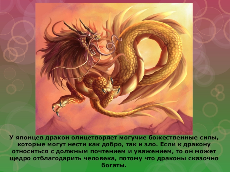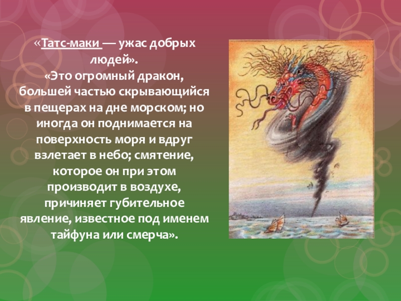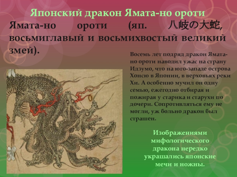 Восемь лет подряд дракон Ямата-но ороти наводил ужас на страну Идзумо, что на юго-западе острова Хонсю в Японии, в верховьях реки Хи. А особенно мучил он одну семью, ежегодно отбирая и пожирая у старика и старухи по дочери. Сопротивляться ему не могли, уж больно дракон был страшен.