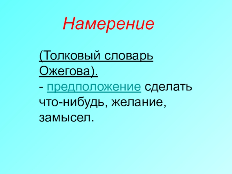 Намерение(Толковый словарь Ожегова). - предположение сделать что-нибудь, желание, замысел.