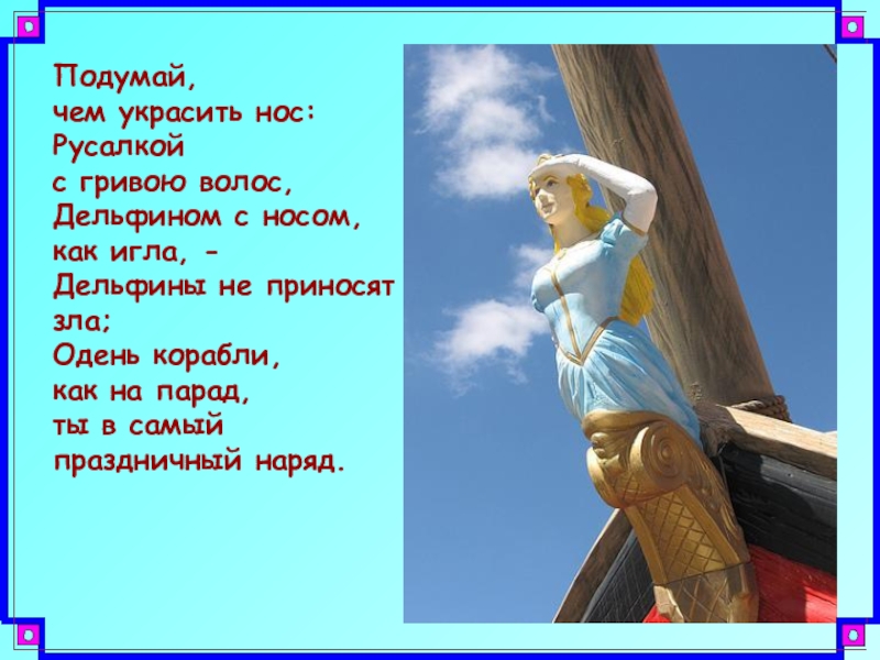 Подумай, чем украсить нос:Русалкой с гривою волос,Дельфином с носом, как игла, - Дельфины не приносят зла;Одень корабли,
