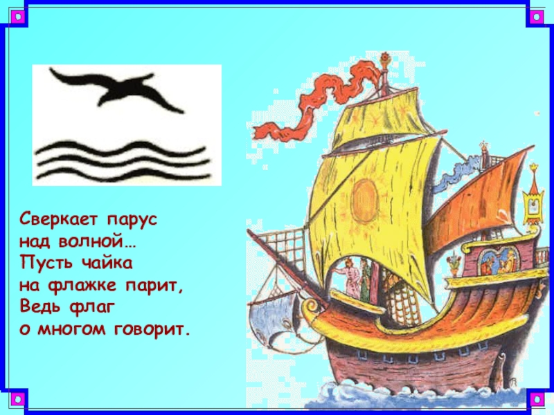 Сверкает парус над волной…Пусть чайка на флажке парит,Ведь флаг о многом говорит.