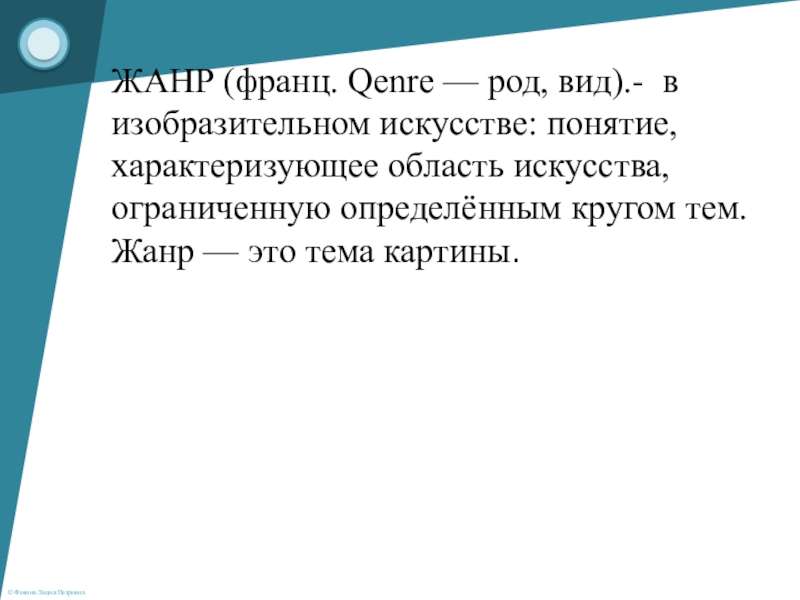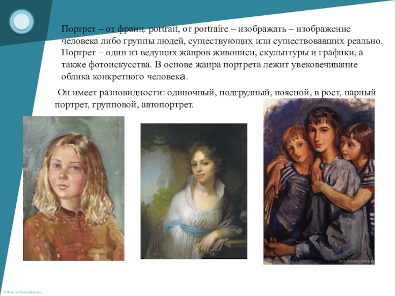 Портрет – от франц. portrait, от portraire – изображать – изображение человека либо группы людей, существующих или существовавших реально. Портрет – один из ведущих жанров живописи, скульптуры и графики, а также фотоискусства. В основе жанра портрета лежит увековечивание облика конкретного человека.