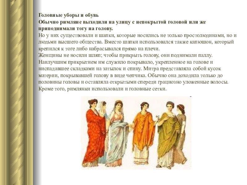 Женщины не носили шляп; чтобы прикрыть голову, они поднимали паллу. Наилучшим прикрытием им служило покрывало, укрепленное на голове и ниспадавшее складками на затылок и спину. Митра представляла собой кусок материи, покрывавшей голову в виде чепчика. Обычно она доходила только до половины головы и оставляла открытыми спереди грациозно уложенные волосы. Кроме того, римлянки использовали и головные сетки.