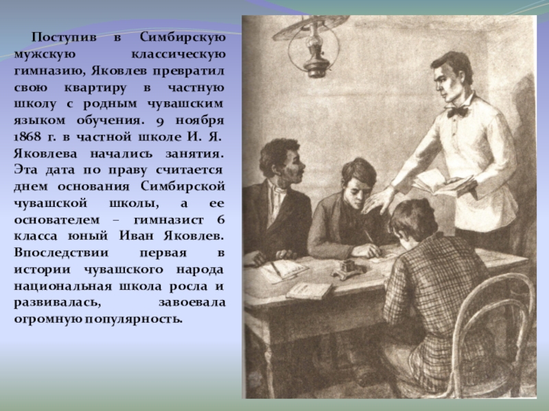 в частную школу с родным чувашским языком обучения. 9 ноября 1868 г. в частной школе И. Я. Яковлева начались занятия. Эта дата по праву считается днем основания Симбирской чувашской школы, а ее основателем – гимназист 6 класса юный Иван Яковлев. Впоследствии первая в истории чувашского народа национальная школа росла и развивалась, завоевала огромную популярность.