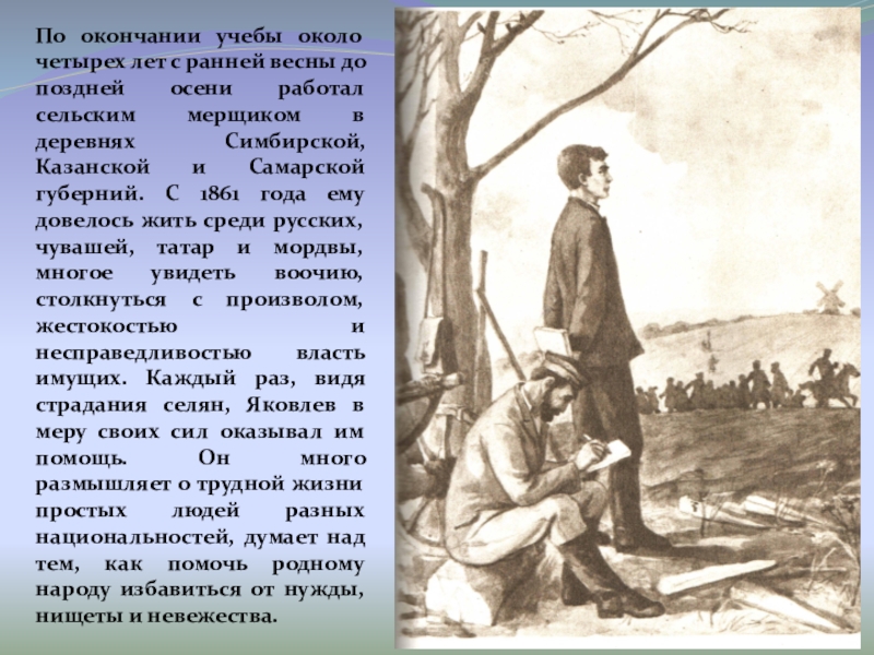 осени работал сельским мерщиком в деревнях Симбирской, Казанской и Самарской губерний. С 1861 года ему довелось жить среди русских, чувашей, татар и мордвы, многое увидеть воочию, столкнуться с произволом, жестокостью и несправедливостью власть имущих. Каждый раз, видя страдания селян, Яковлев в меру своих сил оказывал им помощь. Он много размышляет о трудной жизни простых людей разных национальностей, думает над тем, как помочь родному народу избавиться от нужды, нищеты и невежества.