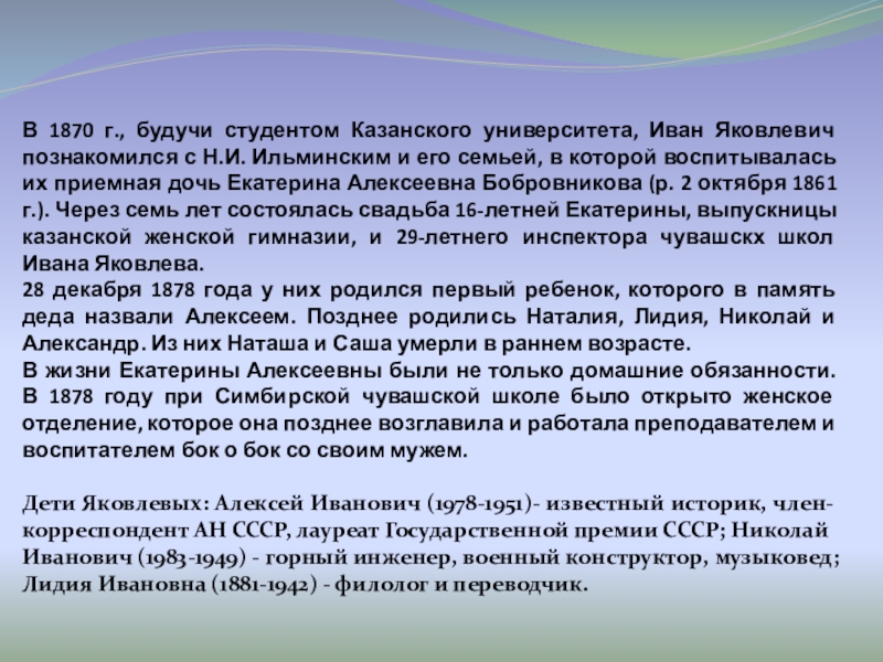 Н.И. Ильминским и его семьей, в которой воспитывалась их приемная дочь Екатерина Алексеевна Бобровникова (р. 2 октября 1861 г.). Через семь лет состоялась свадьба 16-летней Екатерины, выпускницы казанской женской гимназии, и 29-летнего инспектора чувашскх школ Ивана Яковлева.