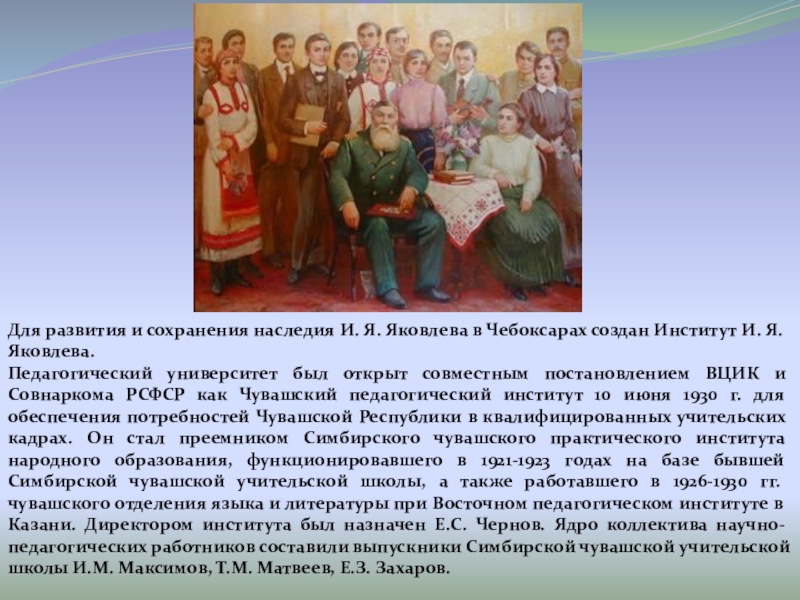 Слайд 20Для развития и сохранения наследия И. Я. Яковлева в Чебоксарах создан