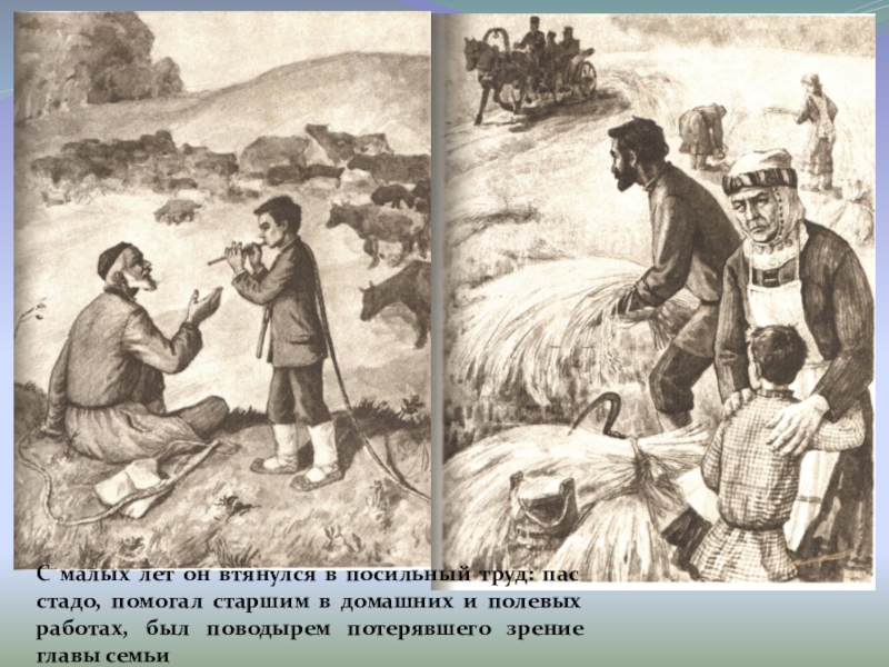 Слайд 3С малых лет он втянулся в посильный труд: пас стадо, помогал
