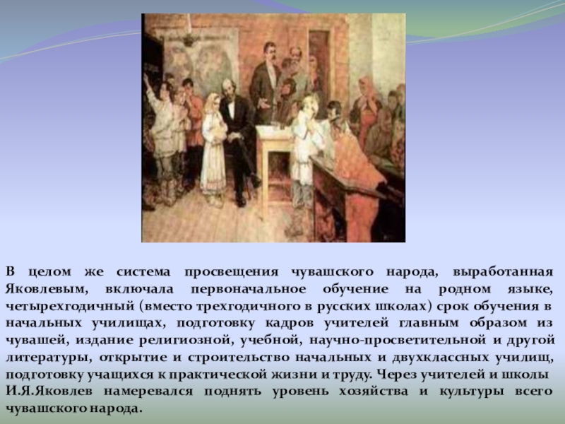 Слайд 14В целом же система просвещения чувашского народа, выработанная Яковлевым, включала первоначальное