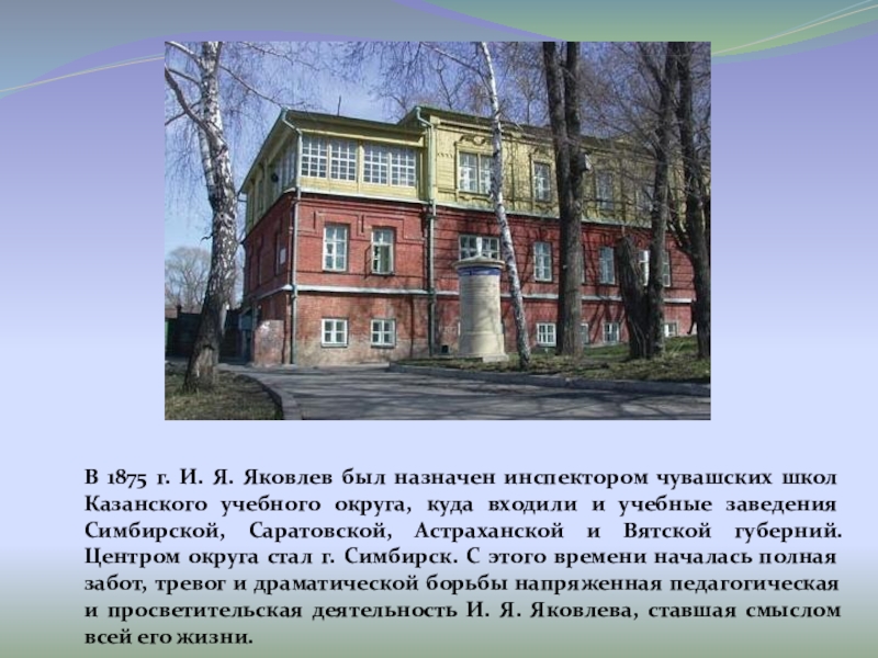 Казанского учебного округа, куда входили и учебные заведения Симбирской, Саратовской, Астраханской и Вятской губерний. Центром округа стал г. Симбирск. С этого времени началась полная забот, тревог и драматической борьбы напряженная педагогическая и просветительская деятельность И. Я. Яковлева, ставшая смыслом всей его жизни.
