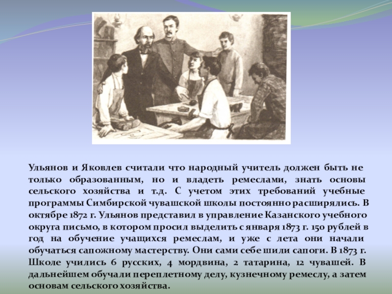 образованным, но и владеть ремеслами, знать основы сельского хозяйства и т.д. С учетом этих требований учебные программы Симбирской чувашской школы постоянно расширялись. В октябре 1872 г. Ульянов представил в управление Казанского учебного округа письмо, в котором просил выделить с января 1873 г. 150 рублей в год на обучение учащихся ремеслам, и уже с лета они начали обучаться сапожному мастерству. Они сами себе шили сапоги. В 1873 г. Школе учились 6 русских, 4 мордвина, 2 татарина, 12 чувашей. В дальнейшем обучали переплетному делу, кузнечному ремеслу, а затем основам сельского хозяйства.