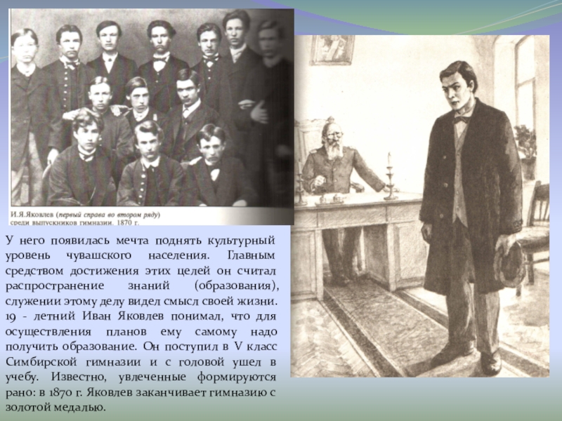 достижения этих целей он считал распространение знаний (образования), служении этому делу видел смысл своей жизни. 19 - летний Иван Яковлев понимал, что для осуществления планов ему самому надо получить образование. Он поступил в V класс Симбирской гимназии и с головой ушел в учебу. Известно, увлеченные формируются рано: в 1870 г. Яковлев заканчивает гимназию с золотой медалью.