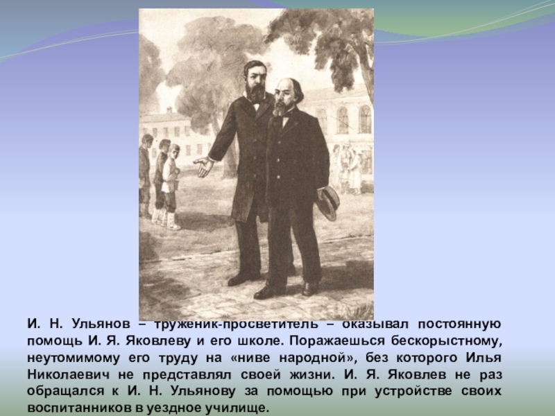 Слайд 10И. Н. Ульянов – труженик-просветитель – оказывал постоянную помощь И. Я.