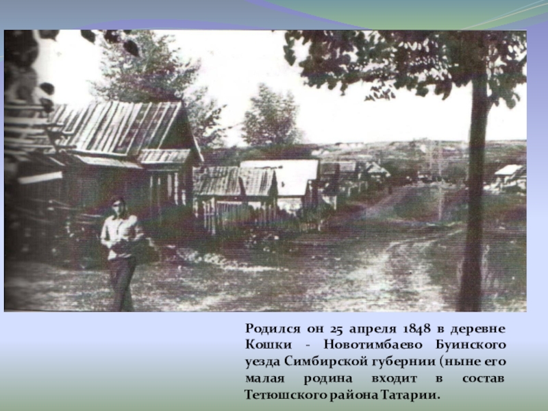 Слайд 2Родился он 25 апреля 1848 в деревне Кошки - Новотимбаево Буинского