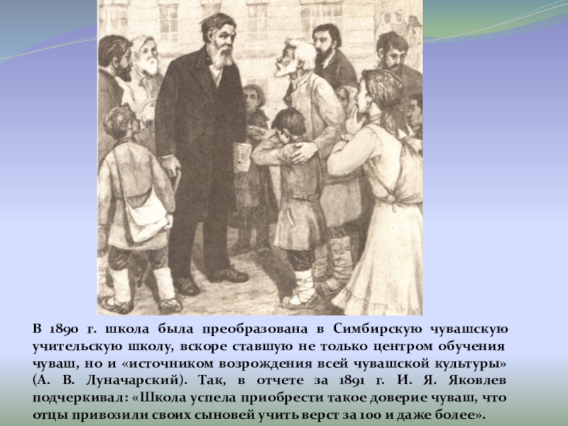 вскоре ставшую не только центром обучения чуваш, но и «источником возрождения всей чувашской культуры» (А. В. Луначарский). Так, в отчете за 1891 г. И. Я. Яковлев подчеркивал: «Школа успела приобрести такое доверие чуваш, что отцы привозили своих сыновей учить верст за 100 и даже более».