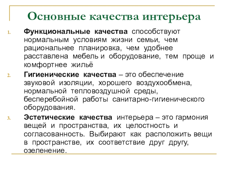 Основные качества интерьераФункциональные качества способствуют нормальным условиям жизни семьи, чем рациональнее планировка, чем удобнее расставлена мебель и