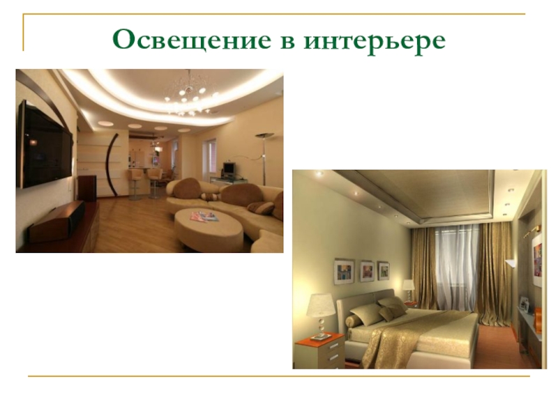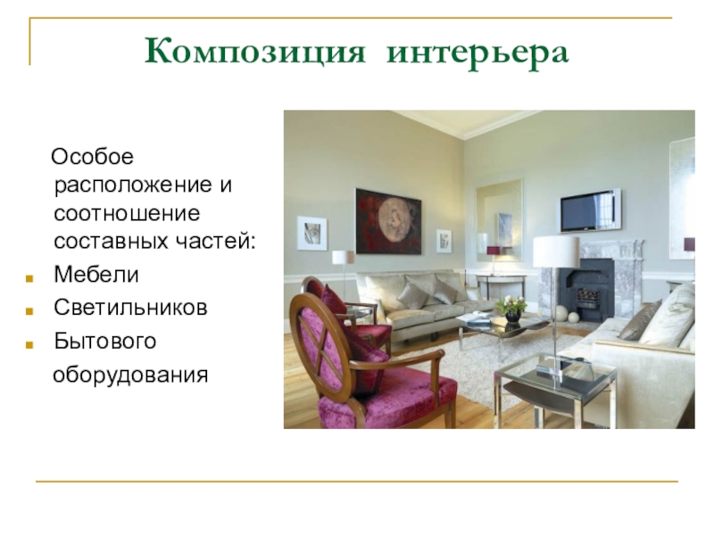 Композиция интерьера   Особое расположение и соотношение составных частей:МебелиСветильниковБытового   оборудования