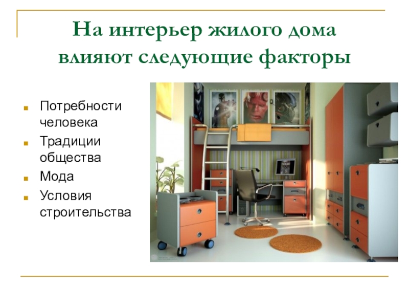 Слайд 3На интерьер жилого дома влияют следующие факторы