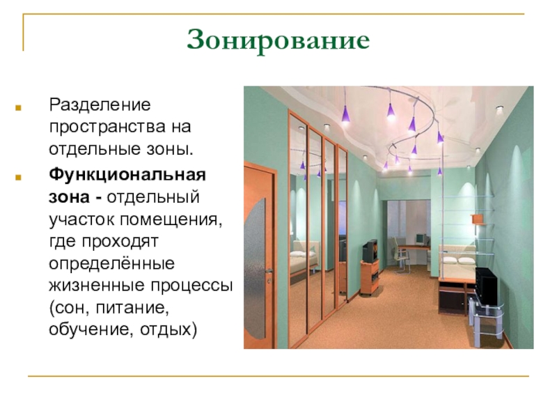 ЗонированиеРазделение пространства на отдельные зоны.Функциональная зона - отдельный участок помещения, где проходят определённые жизненные процессы (сон, питание,