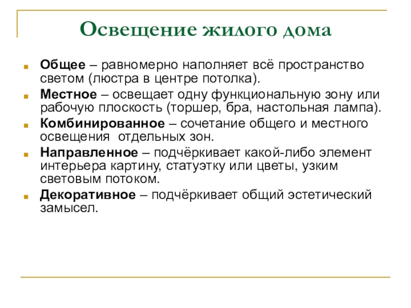 Освещение жилого домаОбщее – равномерно наполняет всё пространство светом (люстра в центре потолка).Местное – освещает одну функциональную