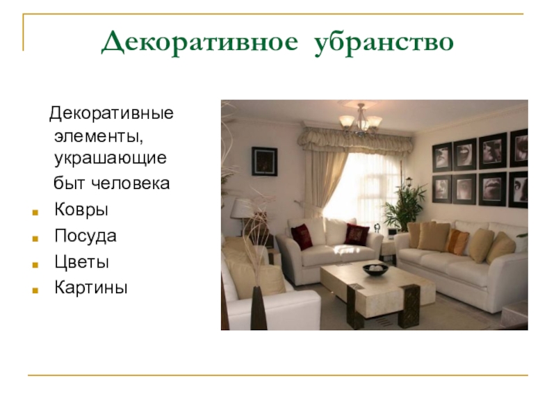 Декоративное убранство  Декоративные элементы, украшающие   быт человекаКоврыПосудаЦветыКартины