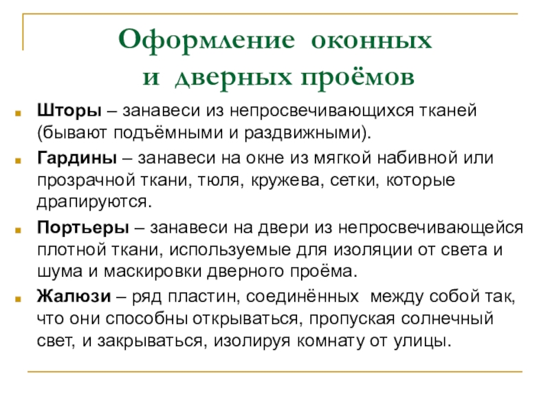 Оформление оконных  и дверных проёмовШторы – занавеси из непросвечивающихся тканей (бывают подъёмными и раздвижными).Гардины – занавеси