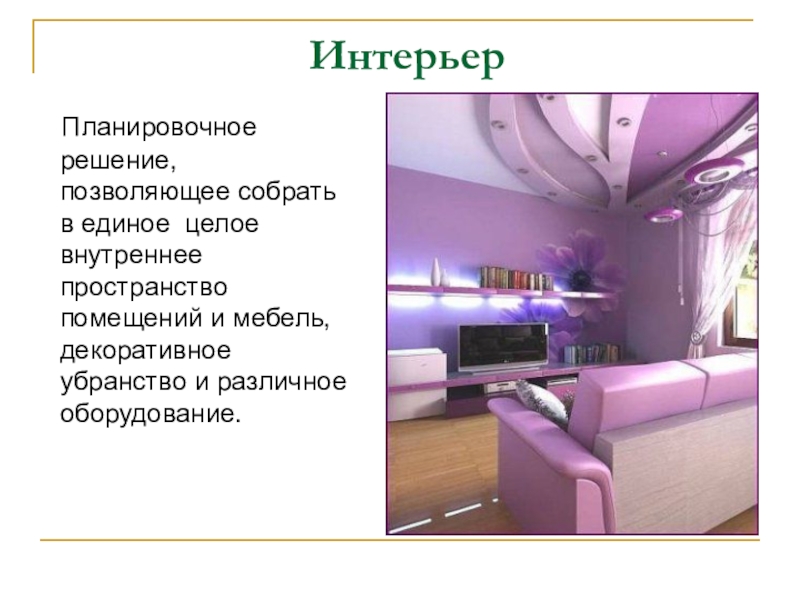 Интерьер   Планировочное решение, позволяющее собрать в единое целое внутреннее пространство помещений и мебель, декоративное убранство