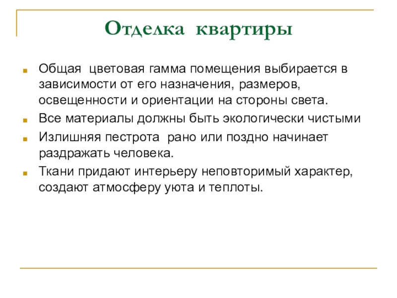 Отделка квартирыОбщая цветовая гамма помещения выбирается в зависимости от его назначения, размеров, освещенности и ориентации на стороны