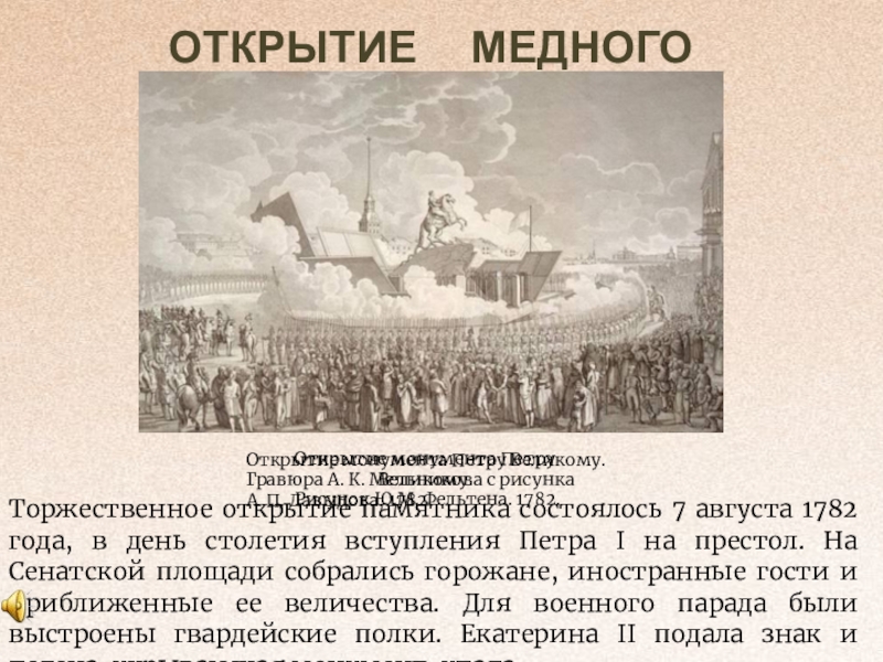 Торжественное открытие памятника состоялось 7 августа 1782 года, в день столетия вступления Петра I на престол. На Сенатской площади собрались горожане, иностранные гости и приближенные ее величества. Для военного парада были выстроены гвардейские полки. Екатерина II подала знак и пелена, укрывающая монумент, упала.